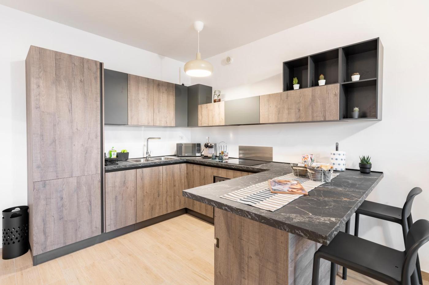 One-Bedroom Apartment. This spacious apartment comprises 1 living room, 1 separate bedroom and 1 bathroom with a shower and free toiletries. Meals can be prepared in the well-fitted kitchenette, which is equipped with a stovetop, a refrigerator, a dishwasher and kitchenware. This apartment is air-conditioned and features a seating area with a flat-screen TV, a washing machine, a tea and coffee maker, a dining area, as well as a wardrobe. The unit offers 2 beds.